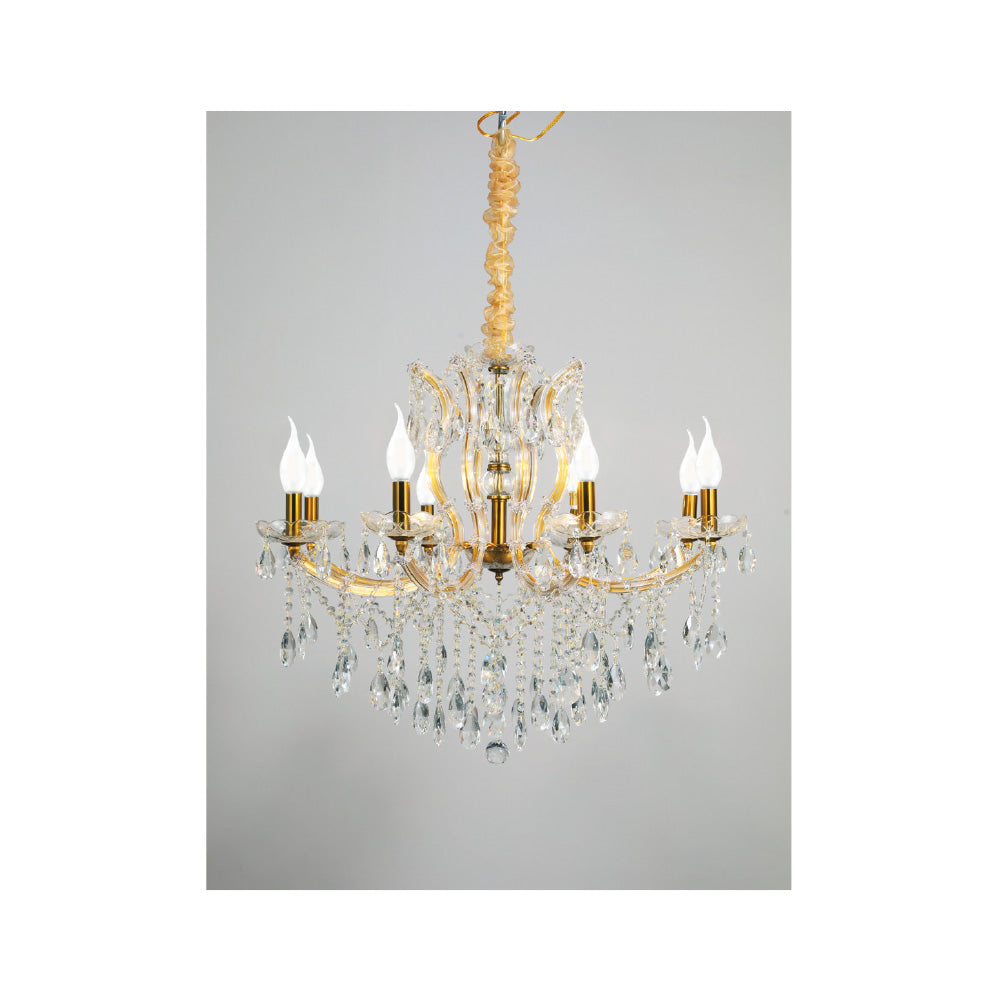 Πρόκειται για ένα κρεμαστό φωτιστικό με οχτώ λαμπτήρες. Το σώμα του αποτελείται από οξυντέ μέταλλο που καλύπτεται από διάφανο γυαλί. Τα κρύσταλλα που το διακοσμούν είναι διάφανα. Η μεταλλική ανάρτηση είναι ρυθμιζόμενη ώστε να προσαρμόζεται στον κάθε χώρο. Διατίθεται και η επιλογή του υφασμάτινου καπέλου το οποίο πρέπει να ζητηθεί...